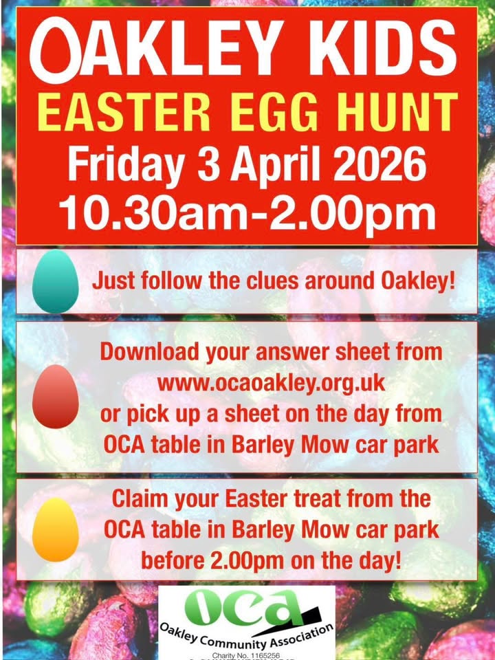 OCA’s Oakley Kids Easter Egg Hunt is BACK! Enjoy a fun-filled morning of clues, treats, and Easter excitement around the village! 🐰🥚 📅 Friday 3rd April 2026 ⏰ 10:30am – 2:00pm ✨ How it works: Follow the clues around Oakley, complete your answer sheet, and don’t forget to collect your Easter treat at the end! 📥 Download your answer sheet here: www.ocaoakley.org.uk 📍 Or pick one up on the day from the OCA table at Barley Mow car park 🎁 Make sure you return to the OCA table before 2:00pm to claim your treat! Bring the kids, invite your friends, and enjoy a lovely Easter activity together 🐣💛 #Oakley #EasterFun #EggHunt #FamilyEvent #OCA