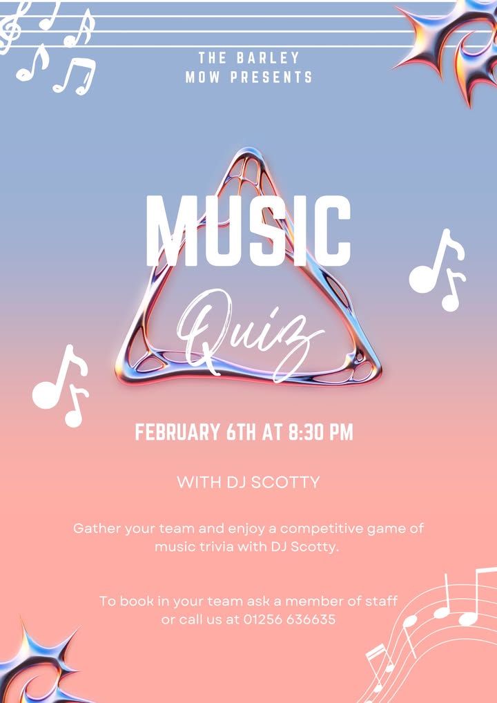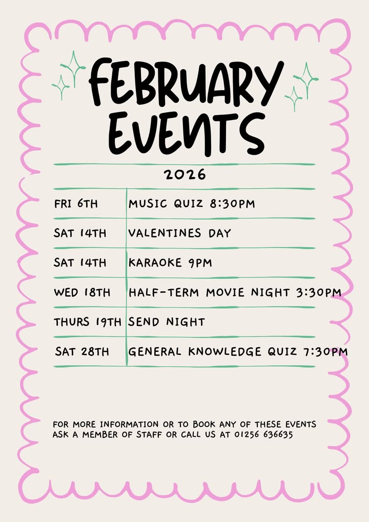 Our February events are here! One thing to note, the music quiz this month will be held outside in the tent, so be sure to bundle up. For more information or to book for any of these events ask a member of staff or call us at 01256 636635.